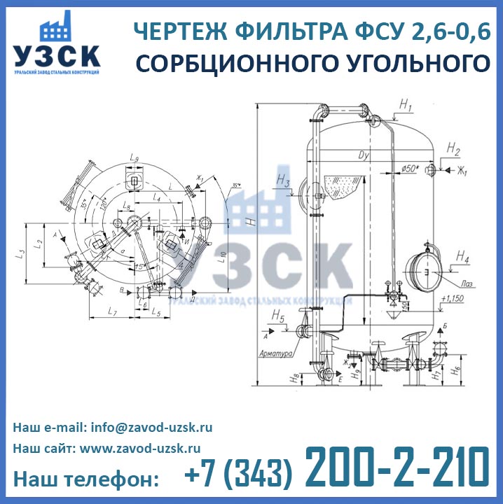Изготовление сорбционных угольных фильтров ФСУ 2,6-0,6 в Токмаке осуществляется из стали. Корпус аппарата представляет собой цилиндрическую обечайку из стального листа с приваренными к ней сверху и снизу штампованными днищами эллиптической формы. Для монтажа на фундамент, фильтр оснащен тремя опорами. Для присоединения трубопроводов обвязки в центре днищ имеются фланцы. Корпус аппарата снабжен двумя люками-лазами, необходимыми для загрузки сорбента, осмотра, ремонта и обслуживания фильтра. Внутри фильтра расположены нижнее сборно-распределительное устройство (НРУ) и верхнее (ВРУ).