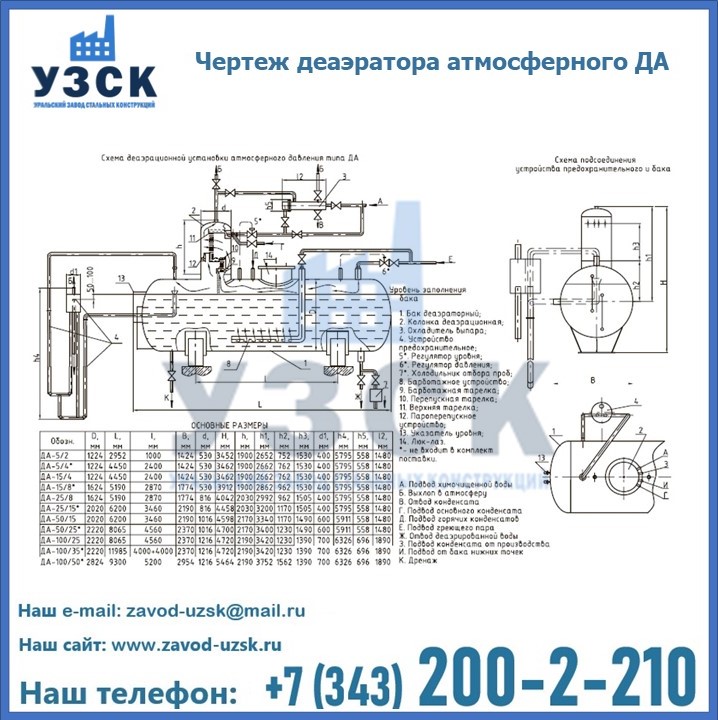 Приобрести качественное оборудование, в том числе, деаэраторы ДА, можно в компании УЗСК в Токмаке. Мы предлагаем долговечную и надежную продукцию по приемлемой цене. Заказать и купить деаэраторы или другие изделия высокого качества можно через сайт Уральского Завода Стальных Конструкций, или позвонив по указанному в разделе «Контакты» телефону.
